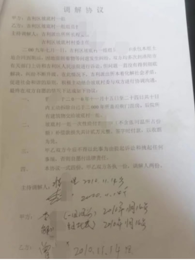 2010年11月14日,一份由吉*派出所所长程*主持的《调解协议》出炉。协议中,甲方为“孟津区坡*村一组”,乙方为曾*华,要求其在2010年11月15日至24日内自行拆除门面房,并将占地1094.2平方米的建筑物移交坡*村一组,补偿款仅2万元。然而,这份协议漏洞百出: