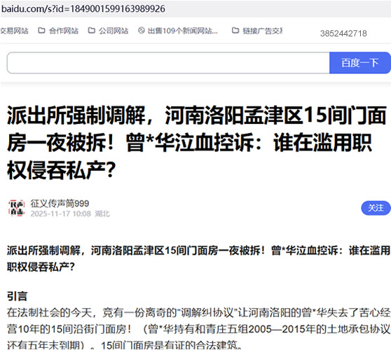 派出所强制调解,河南洛阳孟津区15间门面房一夜被拆!曾*华泣血控诉:谁在滥用职权侵吞私产?